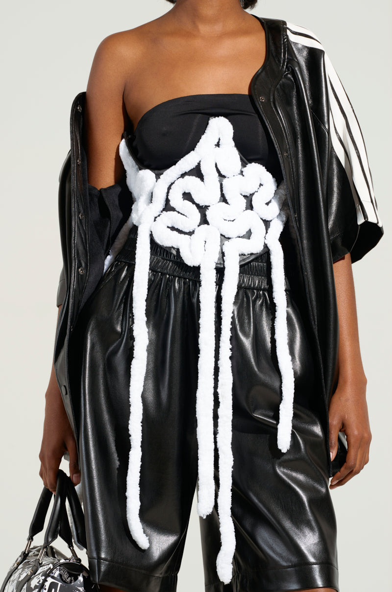 Set the trends inThe AKIRA Label Aesthetic Applique Corset Belt. This unique accessory is crafted from a non-stretch faux leather base and features open cups. internal structural boning. and cozy faux sherpa-inspired yarn detailing that adorns the bodice in an abstract pattern and cascades past the bottom hem. Complete with rounded hems. a sleek inner lining. and a faux silver metallic back zipper closure.