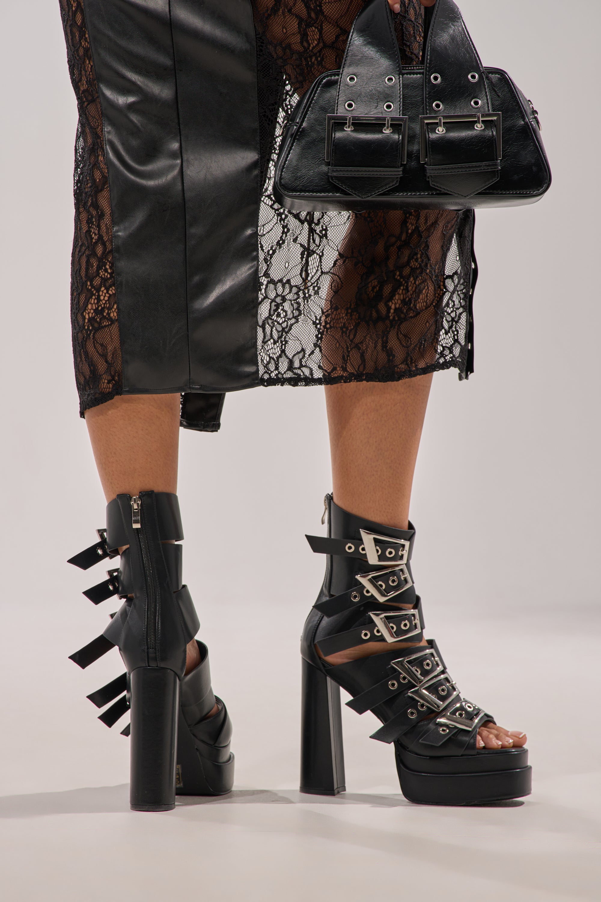 Black faux leather platform sandals. perfect for adding edge to every step. Featuring a sleek faux leather upper with bold multi-strap detailing. an open square toe silhouette. oversized silver-tone buckle hardware with grommet accents for a fierce finish. and a sky-high block heel balanced by a durable platform sole for confident height. Complete with a Comfort Cushion insole and a back zip closure. Style it with a bodycon mini dress. a moto jacket. and a rhinestone clutch for an effortless night-out look.