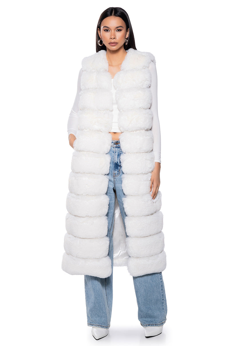 If you were a rich girl… you'd be out rocking this. The AZALEA WANG Give Me Diamonds Faux Fur Panel Vest is an ultra glam. faux fur-based vest complete with a sleeveless design. opulent rhinestone paneling. satiny lining. a maxi length silhouette. and hook and eye front closures. Pair with your favorite turtleneck sweater. mini skirt. and knee high boots to complete the look.