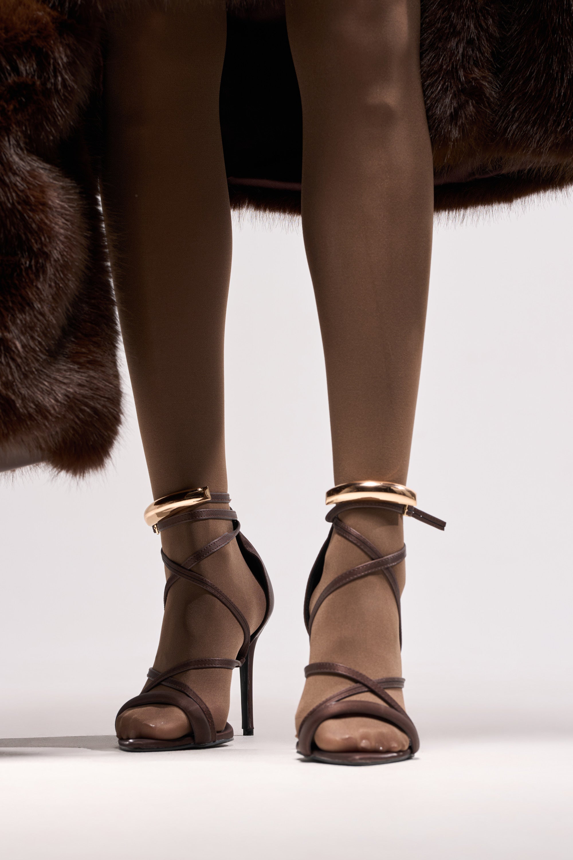 Heels that flirt back. The AZALEA WANG Radha Chocolate Metal Embellished Sandal is crafted from supple satin and features an open pointed toe silhouette. a slim stiletto heel. a slightly puffy toe band. and thin crisscross straps that wrap elegantly around the ankle. Complete with a cushioned faux leather insole and a high-shine gold-tone metal hardware piece that sits at the front of the ankle. Style with anything from micro skirts to maxi dresses for a trendy. IG-ready finish.