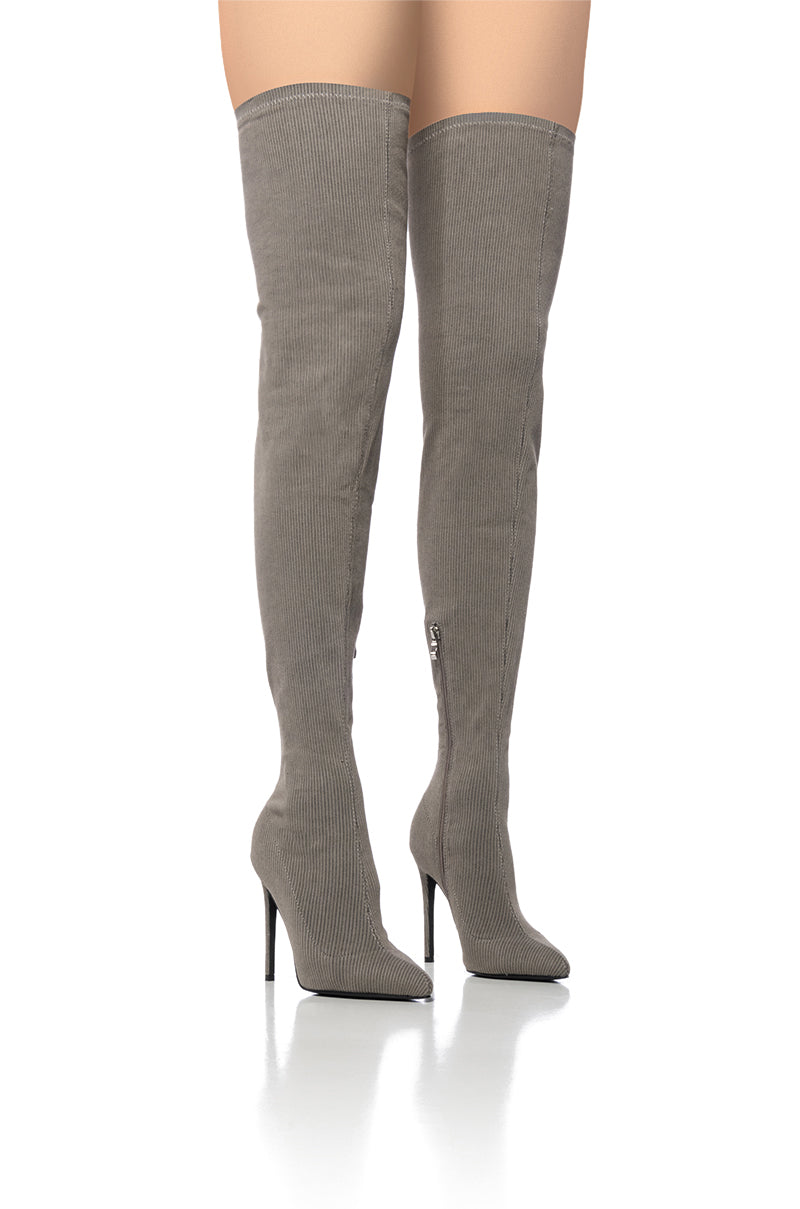 Hey Alexa. play Stargirl. The AZALEA WANG Star Girl Brown Ribbed Boot functions as an iconic thigh high boot and features a slim stiletto heel. a pointed toe. a textured upper. and an inner ankle zipper closure. Style with your best little black dress for a stunning look.