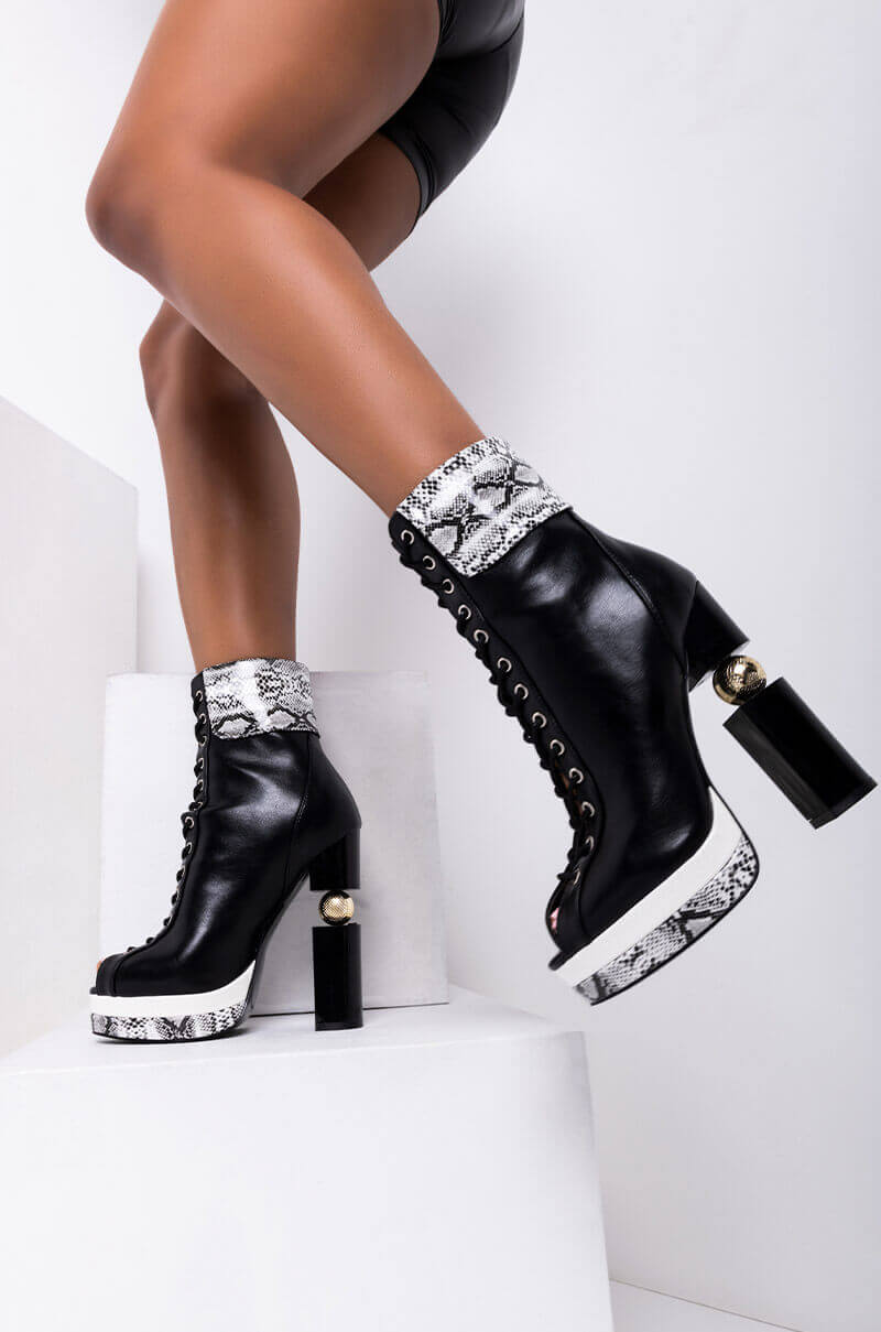 What's on your mind? Get it off your chest in The AZALEA WANG Thinking Out Loud Chunky Heel Bootie in Black. This peep toe ankle bootie features a vegan leather upper. snakeskin print patent leather accents. an open toe front. and chunky block heel with sculptural detailing. Complete with a lace-up vamp and platform sole. Pair with your fave pleather pieces for a matchy matchy look.