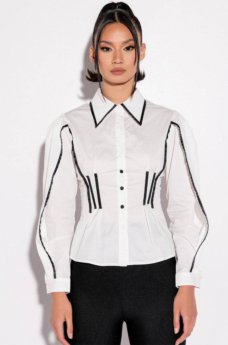 The AWNIS Label Bardot Contrast Trim Button Down Blouse is made from a classic cotton shirt fabrication and features a collared neckline. pleated shoulders. layered long sleeves with button wrist details. corset-style boning on the front and back. contrast trim along the collar. sleeves. and boning. and a button down front closure with contrasting buttons. Wear this fashion-forward piece with denim or trousers for endless versatility!