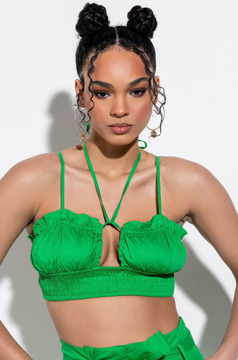 The AKIRA Label Be Somebody Smocked Crop Tank is made from a cotton fabrication and features adjustable spaghetti straps. a smocked elastic body. rounded bust cups with ruffle trim. a plunging neckline with tie. and a cropped silhouette. Pair this piece with the matching AKIRA Label Be Somebody Paperbag Pant and mules for a fiercely chic day look!