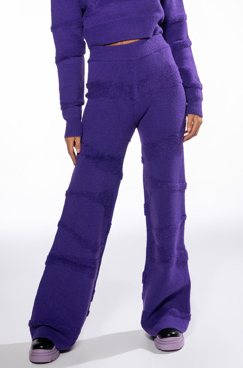 The AWNIS Label Carissa Cozy Knit Wide Leg Pant is made from a fuzzy knit fabrication and features a high rise waist with a ribbed knit elastic waistband. abstract. textured stripe paneling along the legs. and a wide leg silhouette. Pair this piece with the matching AWNIS Label Carissa Cozy Knit Short Sleeve Top to complete your comfy look.