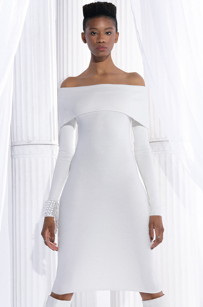 COZY AF PLUSH OFF THE SHOULDER MIDI SWEATER DRESS IVORY