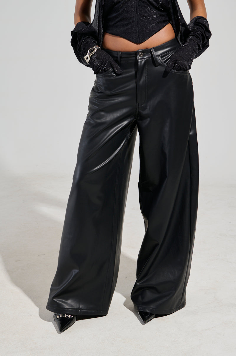 The AWNIS Label Gabrielle Wide Leg Faux Leather Pant In Black is crafted from a stretchy faux leather base and features a mid rise design. functional belt loops. a classic five-pocket style. tonal stitching. and a front zipper and button closure. Complete with a wide leg silhouette.