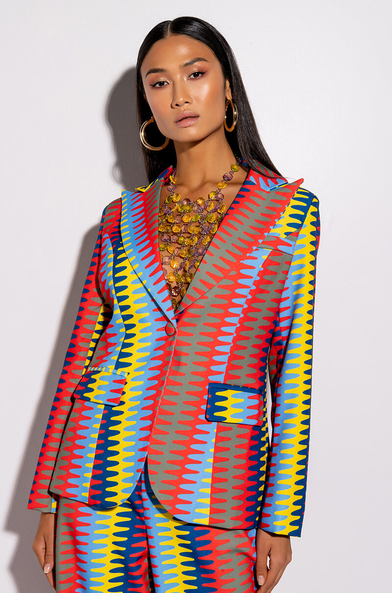 Steal the spotlight in The AWNIS Label Keep Me Focused Blazer. This piece features a smooth and sleek fabrication. an allover organic print. notch collar. padded shoulders. front mock flap pockets. button wrist details. polyester lining. and a single button front closure. Style this with the matching AWNIS Label Keep Me Focused Wide Leg Trousers for an all-out graphic going-out look.