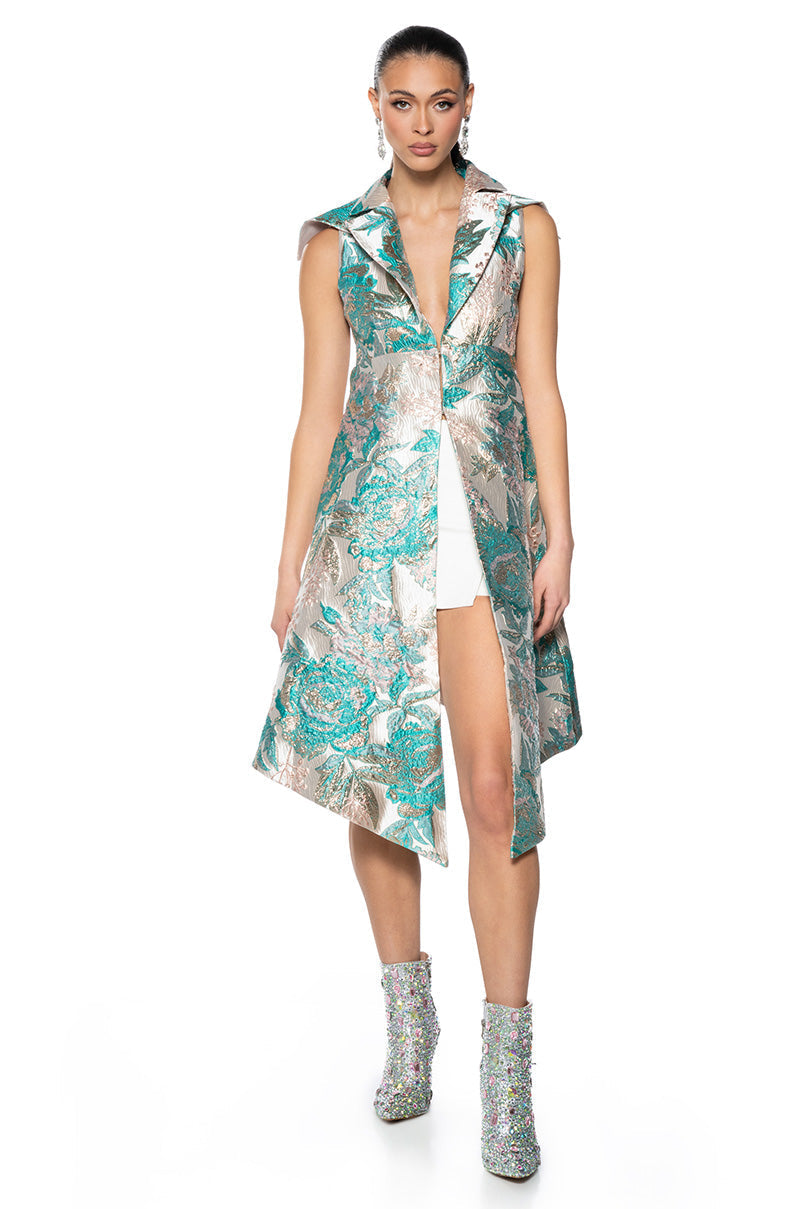 Off to the races! The AWNIS Label Kentucky Longline Jacquard Vest is made from a non-stretch. metallic. floral jacquard fabrication and features a notch collar with a mini capelet detail. a sleeveless design. an empire waist. light polyester lining. and a longline silhouette. Complete with hook and eye front closures.