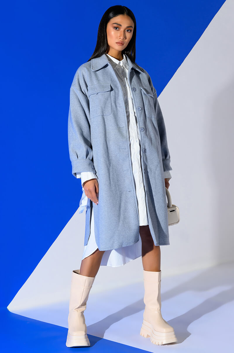 The AWNIS Label No Effort Everyday Long Shacket is made from a fuzzy knit fabrication and features a collared neckline. long sleeves with buttoned cuffs. button flap chest pockets. slant side pockets. a longline silhouette. a rounded hem. and button down front closures.