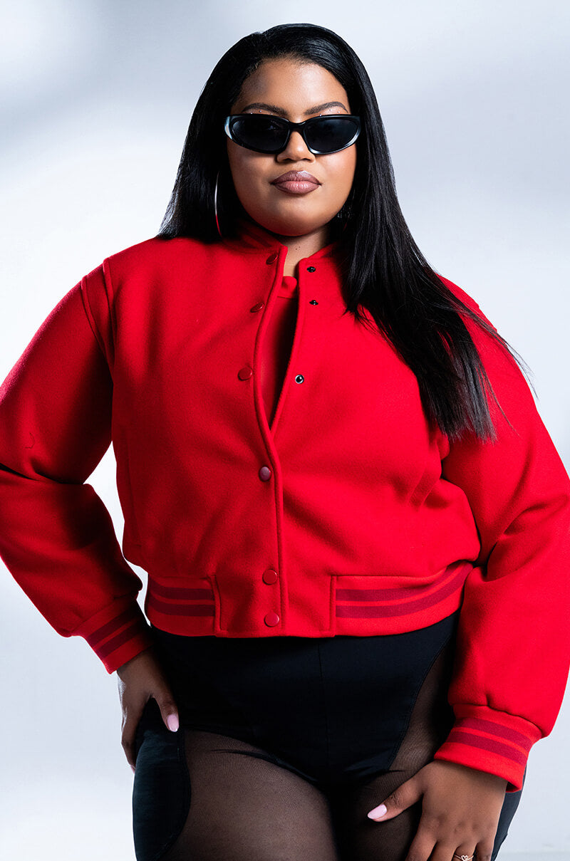 Stay curious with The Plus AZALEA WANG Question Everything Everyday Bomber In Red. This wardrobe must-have is made from a felted knit base and features elastic striped hems. long sleeves. stitched body detailing. slant side pockets. polyester lining. and a cropped silhouette. Complete with a snap button down front closure.
