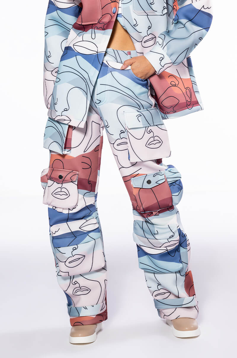 The AWNIS Label Making Faces Printed Cargo Pants feature a soft scuba knit fabrication. abstract silhouette print patterning. a high rise waist. belt loops. a classic 5-pocket design. and cargo pockets rendered in flap front. snap button. and zip top designs. Complete with a classic zip button closure. a wide leg silhouette. triangular stitching at the knee. and ankle strap detailing. Pair with the coordinating AWNIS Label Making Faces Oversized Printed Button Down.