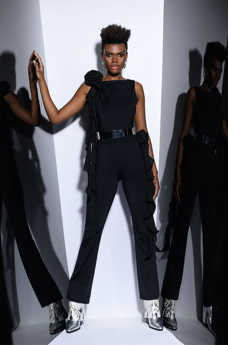 The AWNIS Label Stella Flounced Flared Legging is made from a sleek. stretchy base fabric and features a high waist. a bodycon fit. and a flouncy. mesh floral applique with a cascading ruffle detail on the side. Complete with a flared leg silhouette and a slip-on design. Style with the matching top. The AWNIS Label Stella Flounced Sleeveless Top. for that chic. it-girl look.