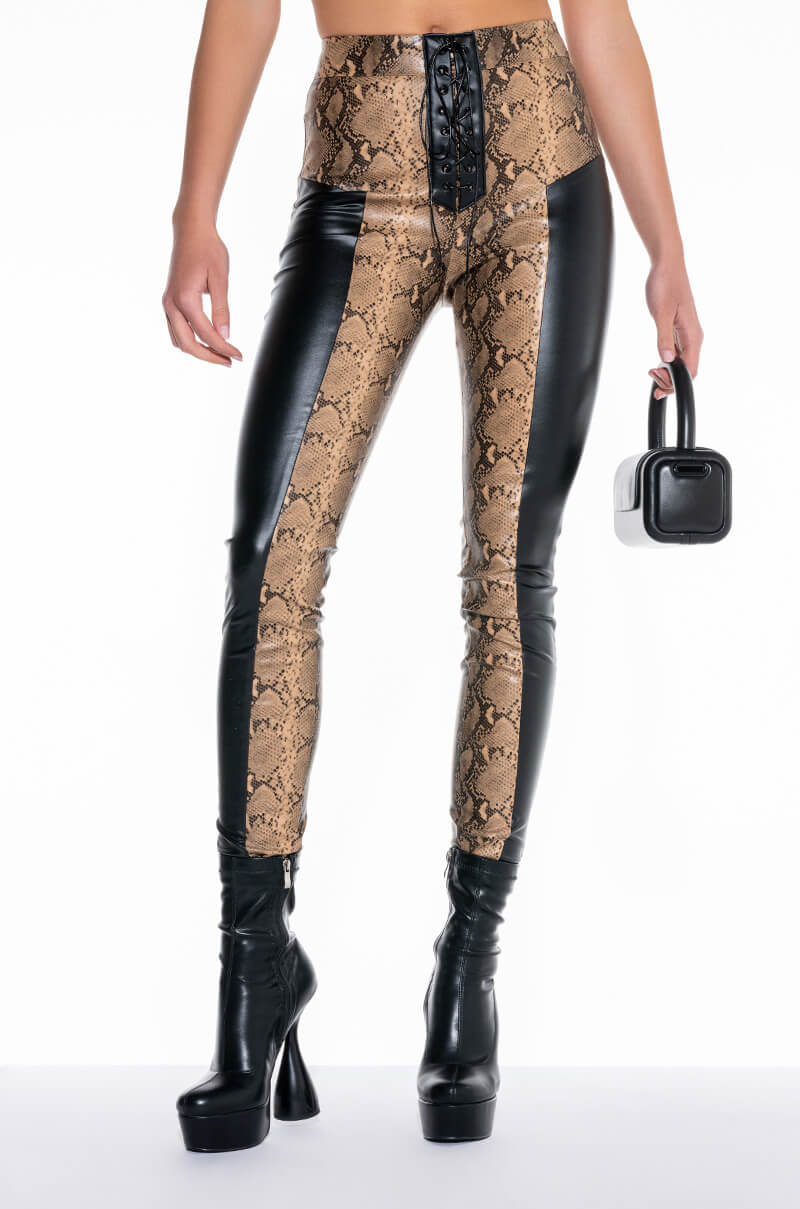 That girl is poison! Jk. just our pants are. The AWNIS Label Venom Lace Up PU Trouser is a faux leather based skinny fitted pant complete with a high waist rise. grommet lace up front fasten. and a snakeskin print PU fabrication. Complete with color block side panel accents and a back zipper closure. Pair with your favorite lace bodysuit and an oversized denim jacket to complete the look.