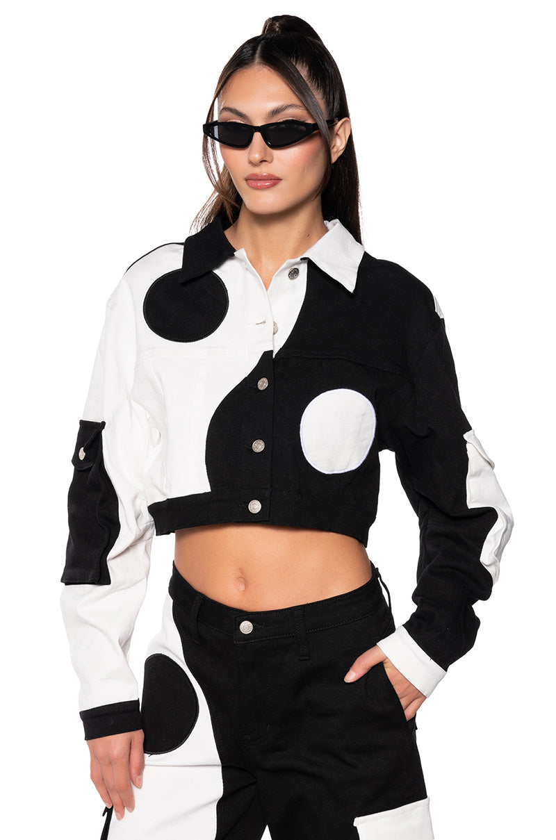 Channeling inner balance in The AWNIS Label Yin And Yang Denim Jacket! Brought to you in a cotton denim base fabrication. this jacket features a pointed two-toned collar. long sleeves with contrast detailing and large button flap arm pockets. a cropped silhouette. contrast seaming. and a button down front closure. Complete with a yin and yang inspired graphic design. Style this piece with the rest of the coordinating fit. The AWNIS Label Yin And Yang Cargo Pocket Relaxed Jeans. and The AWNIS Label Yin And Yang Asymmetrical Denim Top.